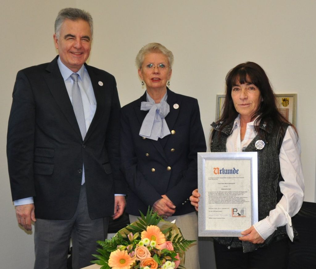 Die Verleihung des Stifterpreises fiel in diesem Jahr weniger festlich, dafür aber nicht minder herzlich aus. Im Büro des Niederzierer Bürgermeisters Frank Rombey überreichte Marie-Theres Innecken-Prüss den Stifterpreis 2021 an Petra Maria Geltenpoth aus Düren. Die 55-Jährige ist Initiatorin und Vorsitzende des Pferdegnadenhofes „Mona und Freunde e.V.“ in Echtz-Konzendorf.